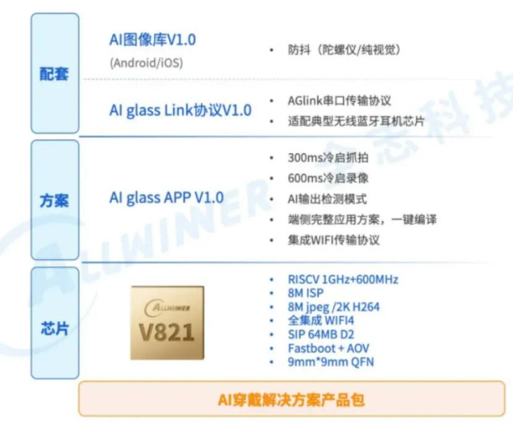 更关键的是,V821的成本极具竞争力,官方披露仅3~5美元,远低于高通AR1 Gen1约60美元的售价。基于此,全志科技推出了名为“慧眼”的AI眼镜解决方案,融合芯片层、方案层、资源层及AI大模型接口,帮助中小厂商快速完成产品定义与量产导入。