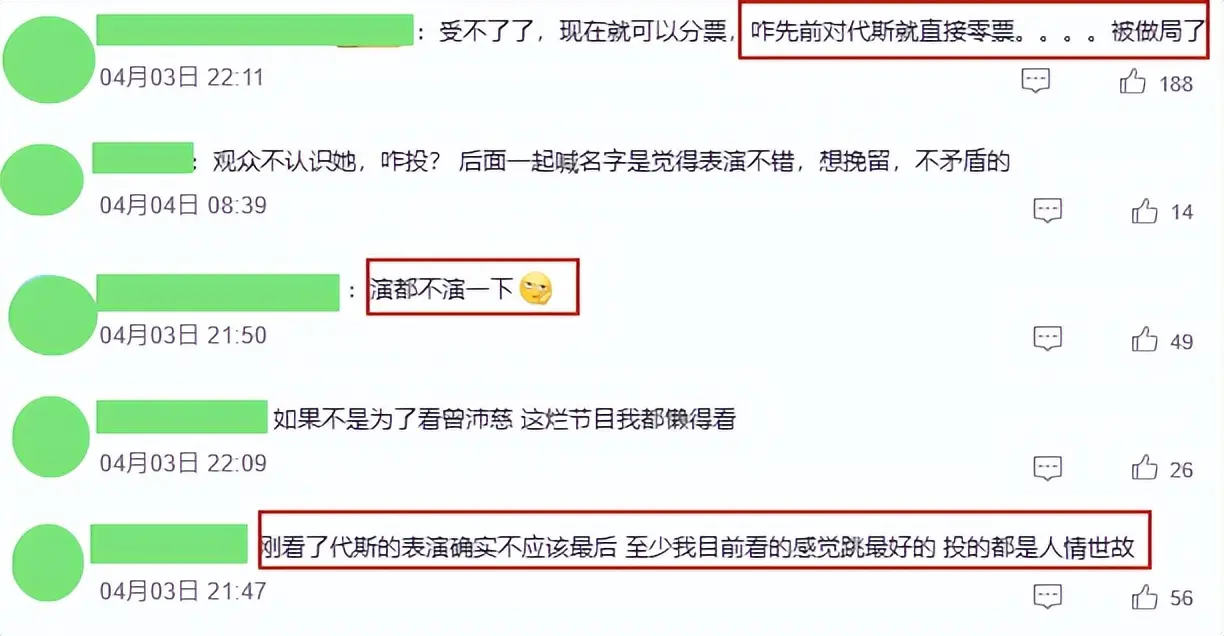 不少观众对此也感到不满,纷纷吐槽“代斯被做局了”,“节目组演都不演一下”,“投的是人情世故”等等。