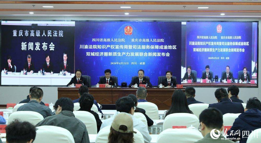 会议现场。人民网记者 李平摄人民网成都4月21日电 (记者李平)4月21日,四川省高级人民法院与重庆市高级人民法院联合举行川渝法院知识产权宣传周暨司法服务保障成渝地区双城经济圈新质生产力发展联合新闻发布会,介绍两省市2025年知识产权司法保护状况。