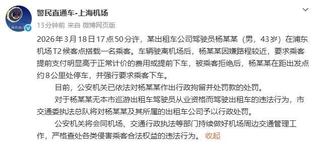 据@警民直通车-上海机场:2026年3月18日17点50分许,某出租车公司驾驶员杨某某(男,43岁)在浦东机场T2候客点搭载一名乘客。车辆驶离机场后,杨某某因嫌路程较近,要求乘客提前支付明显高于正常计价的费用或提前下车,被乘客拒绝后,杨某某在距出发点约8公里处停车,并强行要求乘客下车。