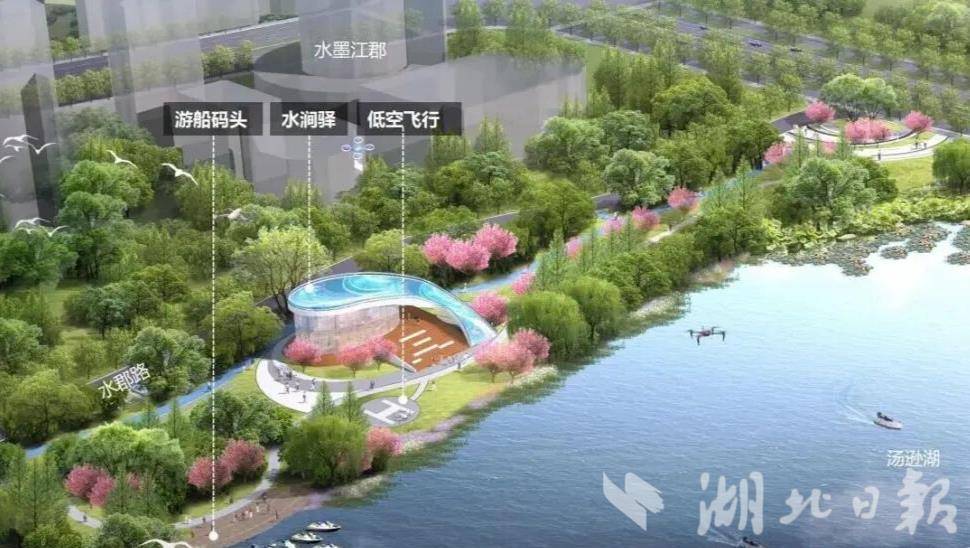 绿道沿线还专门预留了停机坪。项目方介绍,预留这片空间是为未来“打开一扇窗”——无论是无人机配送、低空观光,还是应急救援、智慧巡检,汤逊湖畔都能率先接入低空经济的应用场景,让生态廊道与前沿产业同步生长。
